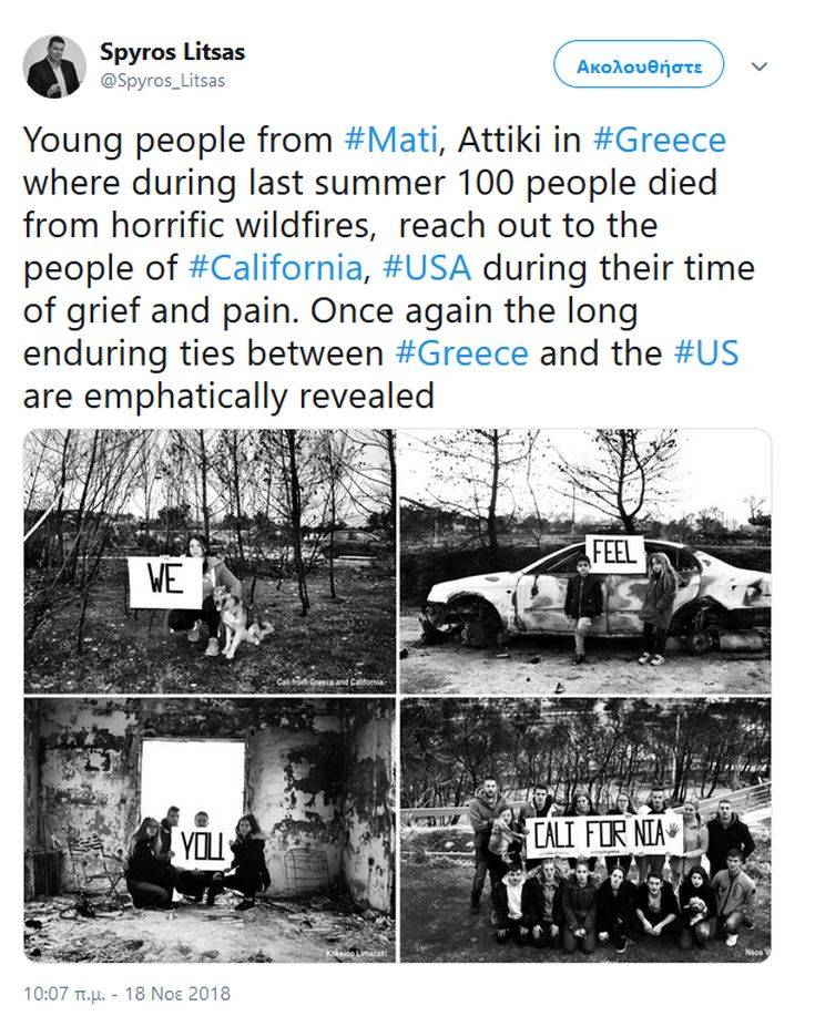 «Σε νιώθουμε Καλιφόρνια», είναι το μήνυμα που στέλνουν οι νέοι από το Μάτι στην Καλιφόρνια, η οποία ζει τον πύρινο εφιάλτη, εκφράζοντας τη συμπαράστασή τους.