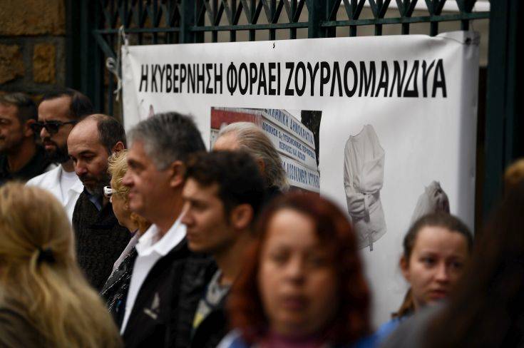 «Η κυβέρνηση φοράει ζουρλομανδύα στα ψυχιατρικά νοσοκομεία» αναγράφει το πανό.