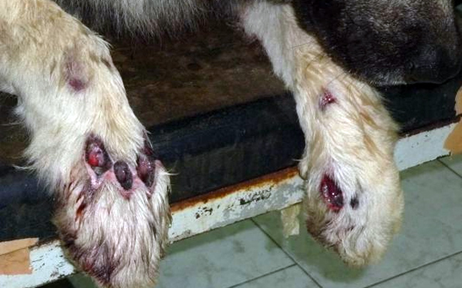 Η φωτογραφία προέρχεται από το www.zoosos.gr και δείχνει τα σημάδια στα πόδια του σκύλου