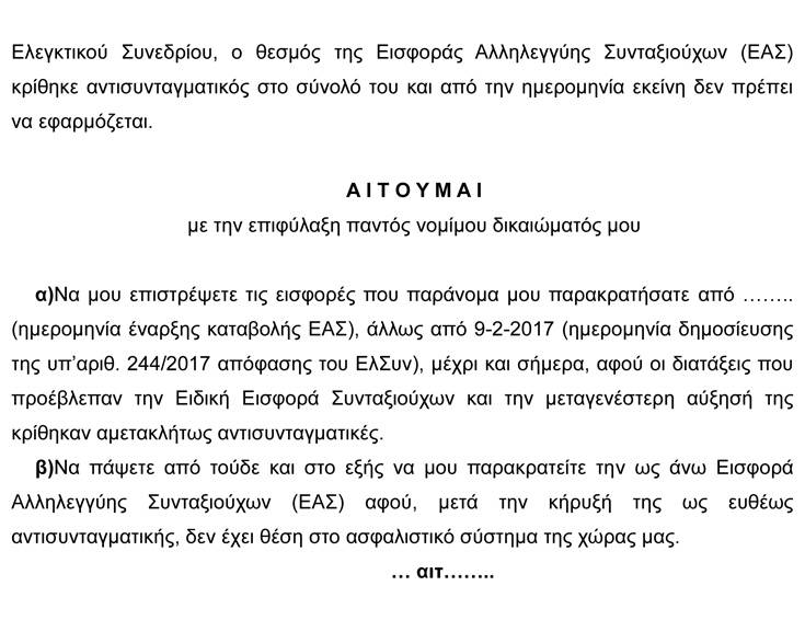 Όσοι ήδη έχουν κάνει αίτηση έχουν το δικαίωμα να μπουν στο κείμενο της ηλεκτρονικής αίτησής τους και να συμπληρώσουν ότι ζητούν την άμεση διακοπή της ΕΑΣ και την επιστροφή αναδρομικών από 9/2/2017.