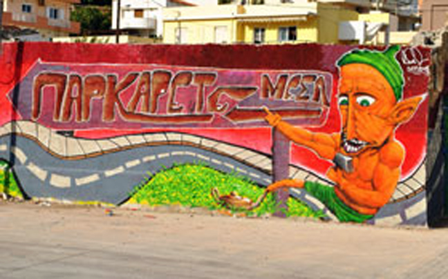 Ξεχωριστά γκράφιτι με σαφή περιβαλλοντικά μηνύματα και ενημερωτικό χαρακτήρα, κοσμούν εδώ και μερικές ημέρες το μέχρι πρότινος άχαρο τοιχίο στο δημοτικό οικόπεδο του Κουμπέ, το οποίο σύντομα θα διατεθεί ως χώρος δωρεάν στάθμευσης στους δημότες.