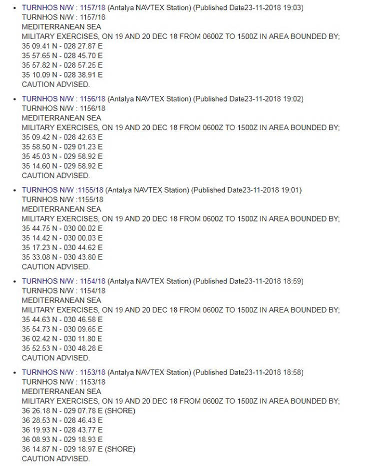 Μετά τις προκλητικές και παράνομες δεσμεύσεις περιοχών για αύριο και μεθαύριο, στην καρδιά του Αιγαίου για άσκηση με υποβρύχια συσκευή και στο βόρειο Αιγαίο για άσκηση με την χρήση όπλων, η Τουρκία με πέντε παράνομες NAVTEX εξαγγέλλει στρατιωτική άσκηση για τις 19 και 20 Δεκεμβρίου και περικυκλώνει επί της ουσίας το Καστελόριζο.