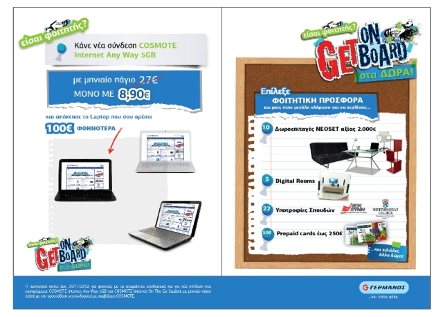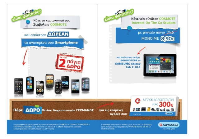 Και τα φοιτητικά δώρα δεν σταματούν εδώ! Ένα μπλοκ δωροεπιταγών «Γερμανός» αξίας 300 ευρώ, περιμένει τους φοιτητές με κάθε νέα σύνδεση Cosmote Απεριόριστα, Cosmote ΚαρτοΣύμβολαιο, Cosmote Internet On The Go Student ή Cosmote Internet Any Way 5GB, ενώ την ίδια στιγμή μπορούν να αποκτήσουν το αγαπημένο τους Smartphone έως και 90 ευρώ φθηνότερα.