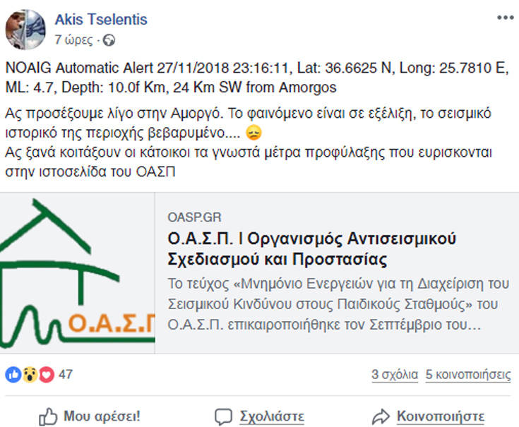 Προσοχή συστήνει στους κατοίκους της Αμοργού ο σεισμολόγος Άκης Τσελέντης, μετά τον σεισμό που σημειώθηκε τα ξημερώματα.