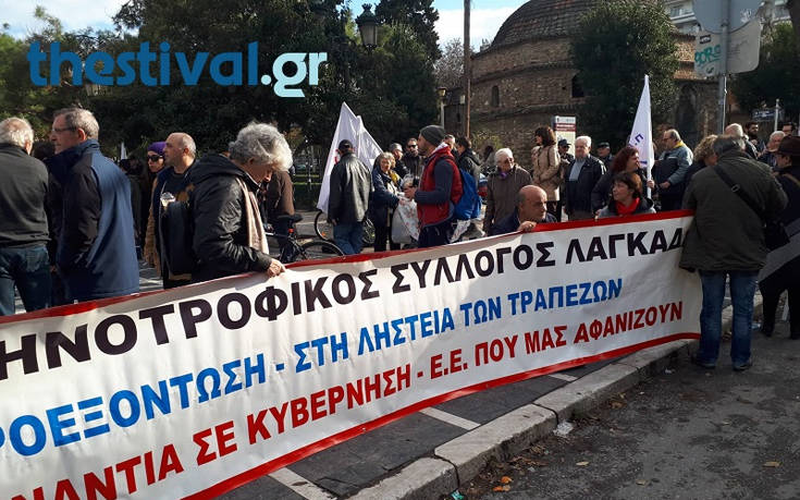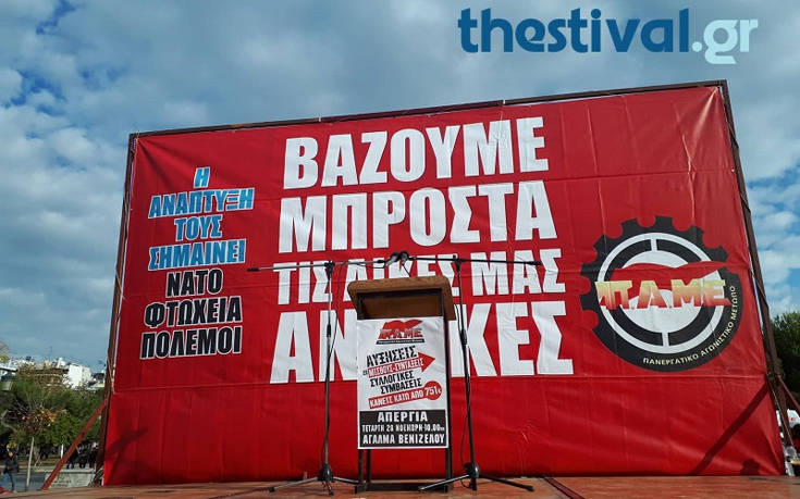 Κρατώντας πανό και φωνάζοντας συνθήματα τα μέλη του ΠΑΜΕ έχουν συγκεντρωθεί μπροστά από το άγαλμα Βενιζέλου, ενώ στη συνέχεια αναμένεται να πραγματοποιηθεί πορεία στους κεντρικούς δρόμους της πόλης.