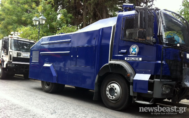 Σε ετοιμότητα βρίσκονται τα πέντε οχήματα της ΕΛ.ΑΣ. που έχουν τη δυνατότητα εκτόξευσης νερού και είναι έτοιμα να «επέμβουν» σε περίπτωση επεισοδίων.
