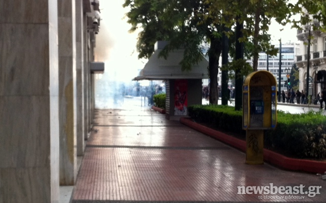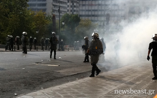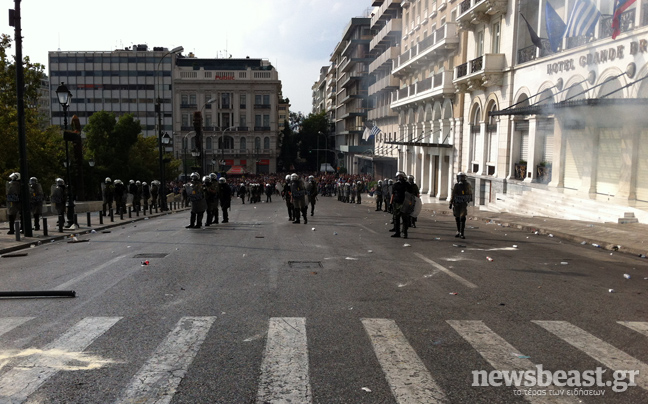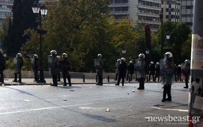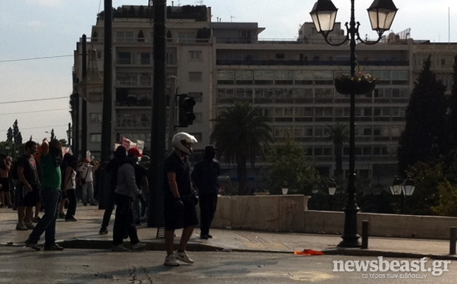 Αυτήν τη στιγμή, ομάδα περίπου 100 διαδηλωτών με κουκούλες, στο μέσον της πλατείας Συντάγματος επιτίθενται με πέτρες και ξύλα εναντίον διμοιρίας των ΜΑΤ που βρίσκεται επί της οδού Βασ. Σοφίας, μπροστά στο ξενοδοχείο Μ. Βρετάνια.