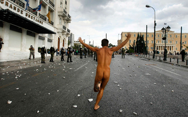 Από τα ρούχα του, κυριολεκτικά, βγήκε νωρίτερα ένας άντρας ο οποίος αποφάσισε να διαδηλώσει με τον δικό του τρόπο και κυκλοφορούσε γυμνός μπροστά από τον Άγνωστο Στρατιώτη.