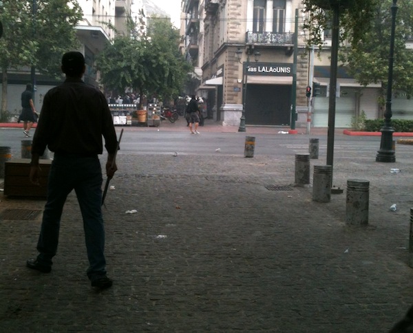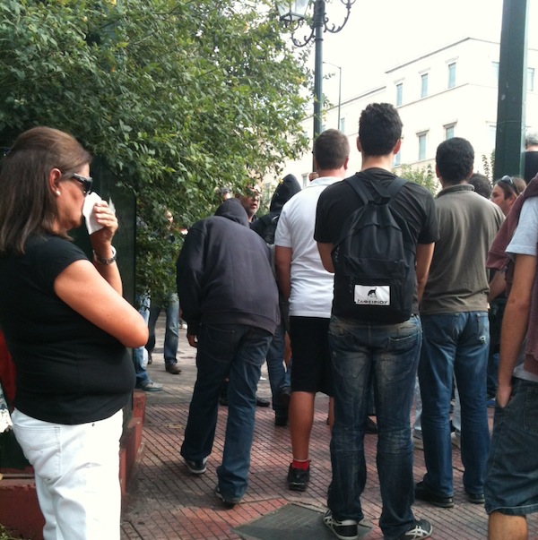 Επειδή κάποιοι παριστάμενοι τον άκουγαν να καθοδηγεί κάτι νεαρούς κουκουλοφόρους (σαν κι αυτόν της επόμενης φωτογραφίας) για το πώς θα κινηθούν.