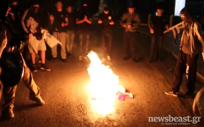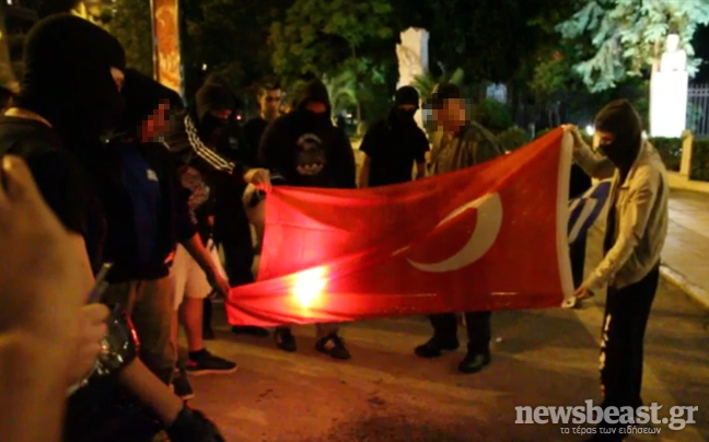 Την τουρκική σημαία έκαψαν συγκεντρωμένοι στη συμβολή των οδών Ρηγίλλης και Βασιλίσσης Σοφίας, όπου βρίσκεται το μνημείο των Ιμίων, σε διαδήλωση του «Εθνικού Μετώπου», με αφορμή την επίσκεψη του τούρκου υπουργού Εξωτερικών Αχμέτ Νταβούτογλου.