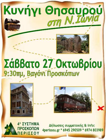 Το 4ο Σύστημα Προσκόπων Περισσού, στο πλαίσιο των εορτασμών για τα 60χρόνια συνεχούς λειτουργίας του Συστήματος, διοργανώνουν Κυνήγι Θησαυρού στη Νέα Ιωνία, το Σάββατο 27 Οκτωβρίου 2012.
