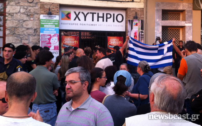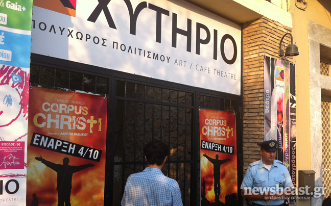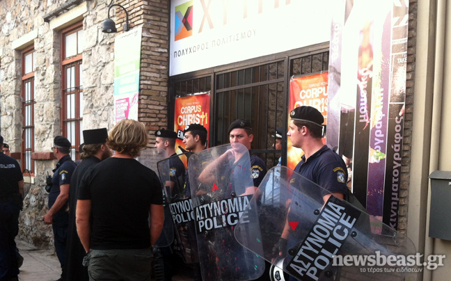 Περικυκλωμένοι από δυνάμεις των ΥΜΕΤ και των ΜΑΤ, μέλη παραθρησκευτικών οργανώσεων και της Χρυσής Αυγής διαδηλώνουν και σήμερα έξω από το θέατρο Χυτήριο, στην Ιερά Οδό, καθώς αντιδρούν στο ανέβασμα της παράστασης «Corpus Christi». Η Ιερά Οδός είναι κλειστή και στα δύο ρεύματα.