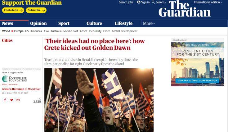 To «πώς η Κρήτη πέταξε έξω τη Χρυσή Αυγή» καταγράφει σε εκτενές ρεπορτάζ από το Ηράκλειο η εφημερίδα Guardian, περιγράφοντας το πώς η Χρυσή Αυγή αναπτύχθηκε στην πόλη, προτού τον περασμένο Μάιο κλείσει τα εκεί γραφεία της.