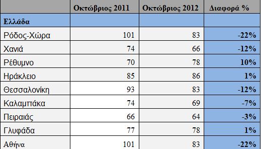 Συνολικά στην Ελλάδα το ποσοστό μείωσης που παρατηρείται για τον Οκτώβριο είναι της τάξεως του 11% με μέση τιμή 85 ευρώ, ενώ την ίδια περίοδο πέρυσι η μέση τιμή κυμαινόταν στα 95 ευρώ.
