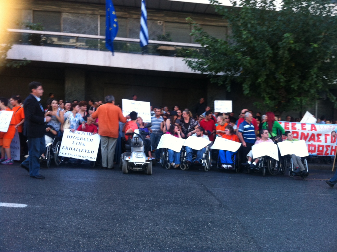 Παράσταση διαμαρτυρίας πραγματοποίησαν άτομα με αναπηρία σήμερα στα γραφεία της Αντιπροσωπείας της ΕΕ στην Αθήνα διαμαρτυρόμενα για την κατάσταση που επικρατεί στα ειδικά σχολεία, τα οποία παραμένουν κλειστά εξαιτίας των ελλείψεων σε υποδομές, και κυρίως εξαιτίας του προβλήματος μεταφοράς των παιδιών.