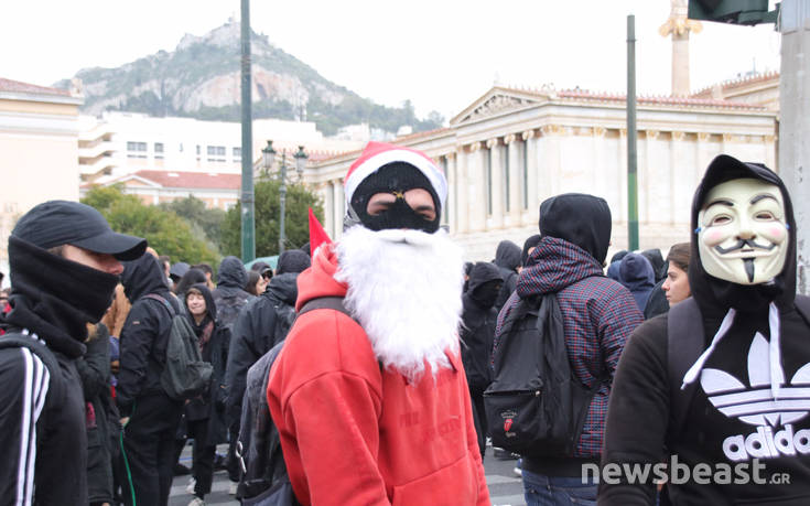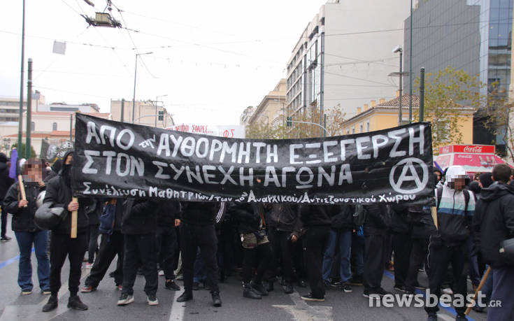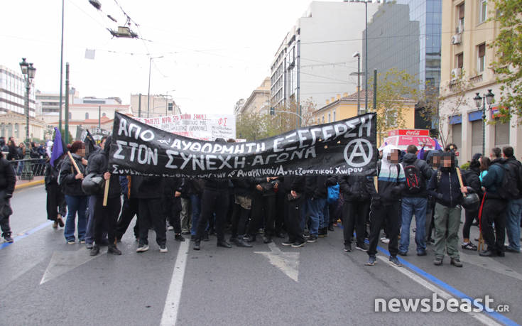 Τα μέτρα ασφαλείας από την ΕΛ.ΑΣ, για ακόμη μια χρονιά, είναι δρακόντεια, αλλά ήδη κάποιοι από τους συμμετέχοντες σπάνε φανάρια, καθώς περνά η πορεία και μαζεύουν πέτρες.