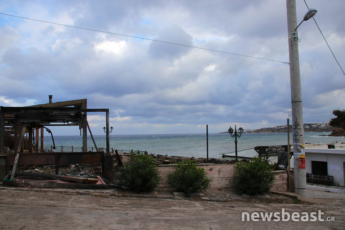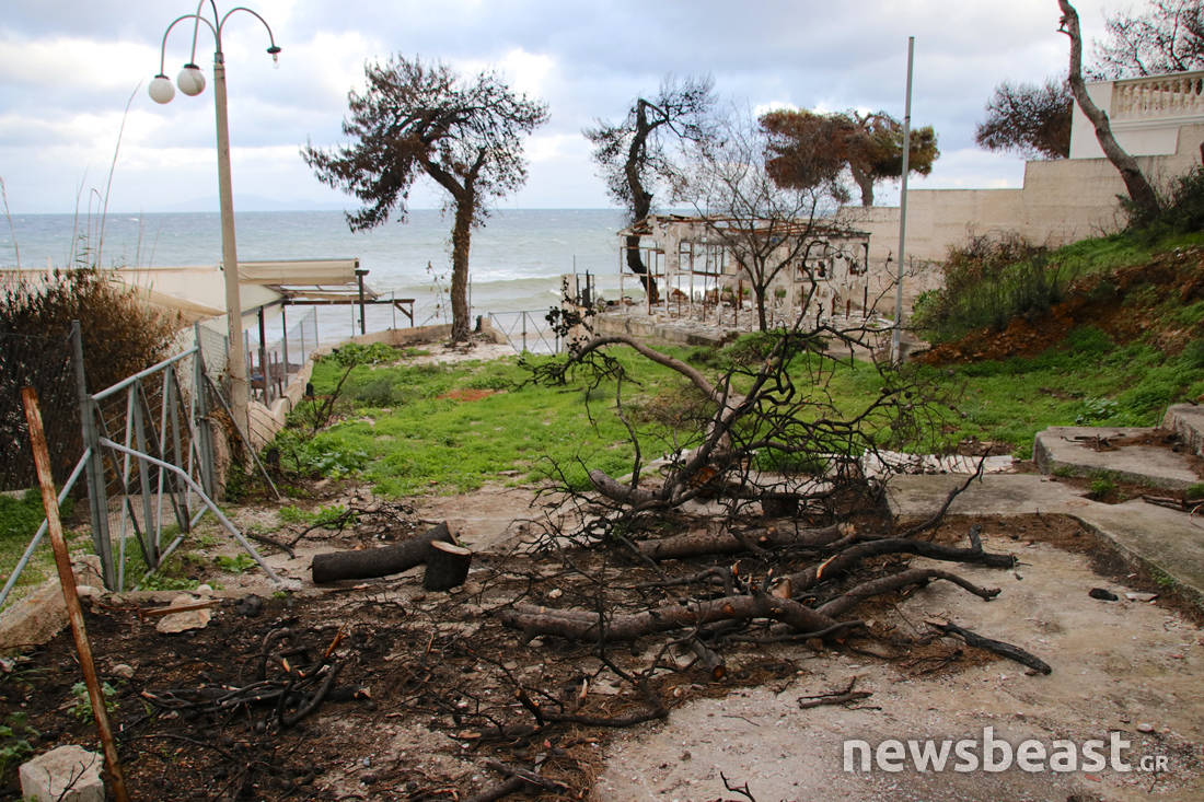 Περνώντας από τη Λεωφόρο Μαραθώνος και μπαίνοντας στο Μάτι αντικρίζεις τη μπουλντόζα που μαζεύει τους καμένους κορμούς και τα κλαδιά για να τα φορτώσει στο φορτηγό, τους ντόπιους που φροντίζουν όπως όπως τον κήπο και τις αυλές τους που προσπέρασαν οι φλόγες και τους εργάτες που κάνουν μερεμέτια.