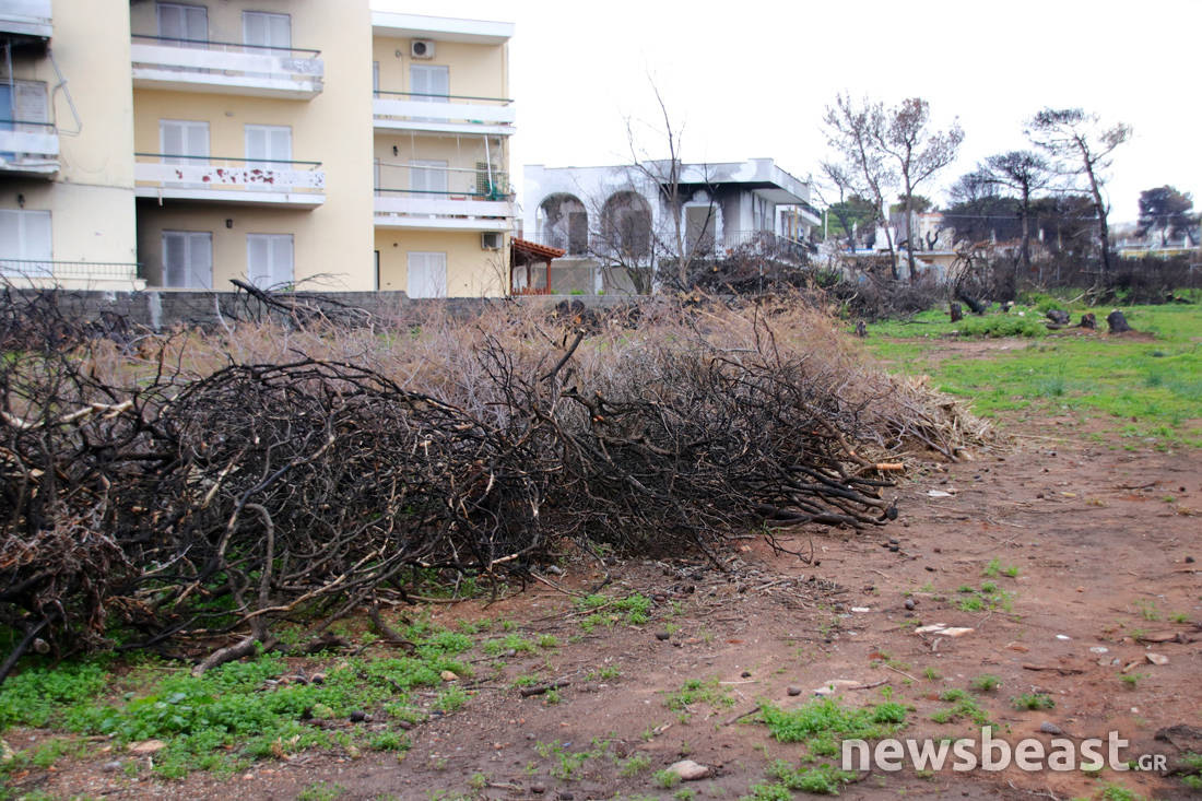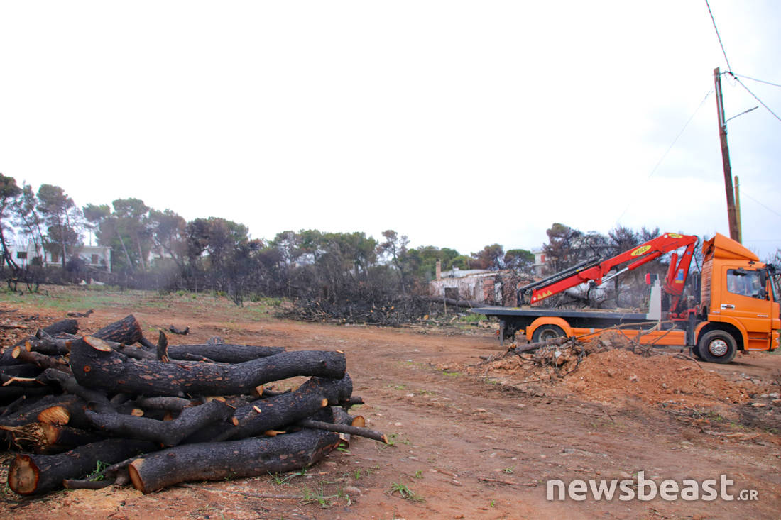 Οι διαδικασίες υλοτόμησης και απομάκρυνσης των καμένων δέντρων πραγματοποιούνται εντατικά και συντονισμένα σε μια τεράστια προσπάθεια που γίνεται ώστε το Μάτι να συνέλθει και να αποκτήσει και πάλι ζωή σε πείσμα του γκρίζου τοπίου.