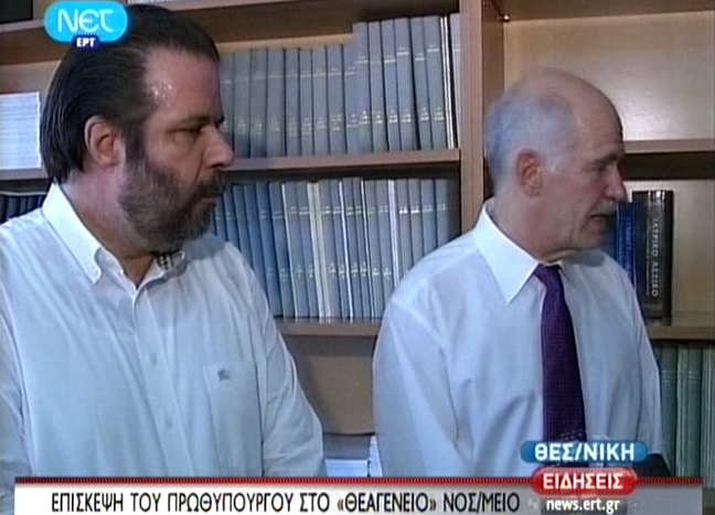 Ήταν όντως αιφνιδιαστική η επίσκεψη του πρωθυπουργού στο Αντικαρκινικό Θεαγένειο Νοσοκομείο Θεσσαλονίκης! Αυτό μαρτυρά άλλωστε ο ιδρώτας από τον οποίο «λούστηκε» ο συμπαθέστατος κατά τ’ άλλα κύριος που διακρίνεται δίπλα στον Γιώργο Παπανδρέου… Όχι, δεν φταίνε τα φώτα, ούτε η έλλειψη κλιματιστικού. Το άγχος που ένιωσαν τα μέλη της διοίκησης από τον αιφνιδιαστικό επισκέπτη φταίει…