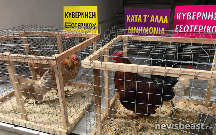 Κόκορες στην είσοδο του υπουργείου Υγείας άφησαν οι εργαζόμενοι στα δημόσια νοσοκομεία κατά τη διάρκεια σημερινής κινητοποίησης που βρίσκεται ακόμη σε εξέλιξη.