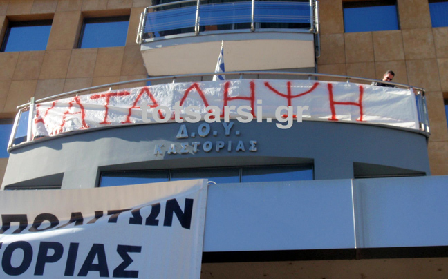 Υπό κατάληψη τελεί η ΔΟΥ Καστοριάς από πολίτες που διαμαρτύρονται για την τιμή του πετρελαίου θέρμανσης. Αύριο και μεθαύριο θα μείνουν κλειστά τα σχολεία, οι υπηρεσίες και τα καταστήματα στην πόλη σύμφωνα με την ιστοσελίδα totsarsi.gr