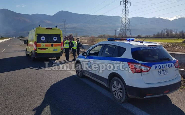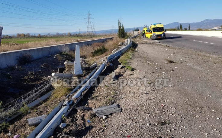 Στο ρεύμα προς Αθήνα, στην ευθεία έξω από την πόλη της Λαμίας, έσκασε το λάστιχο διερχόμενης νταλίκας, με αποτέλεσμα ο οδηγός να χάσει τον έλεγχο του οχήματος και να ξηλώσει τις προστατευτικές μπάρες.