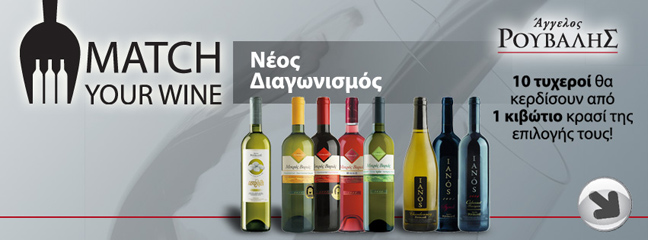 Η σελίδα του οινοποιείου του Άγγελου Ρούβαλη στο facebook διοργανώνει διαγωνισμό με τίτλο «Match your wine!» και δίνει τη δυνατότητα σε 10 τυχερούς να κερδίσουν από 1 κιβώτιο κρασί της επιλογής τους!