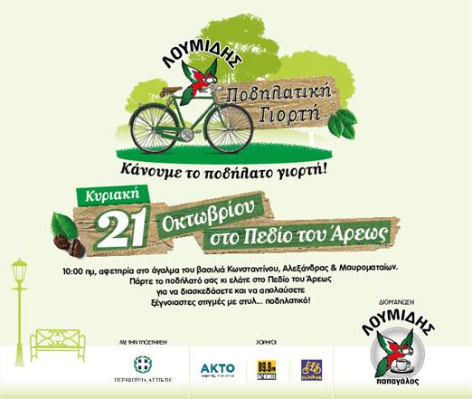 Ραντεβού λοιπόν με τον Λουμίδης Παπαγάλος την Κυριακή 21 Οκτωβρίου και ώρα 10:00 πμ, στο Πεδίο του Άρεως, στο άγαλμα του Βασιλιά Κωνσταντίνου (Λεωφόρος Αλεξάνδρας & Μαυροματαίων), για να κάνετε το ποδήλατο… γιορτή!