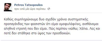 Στους «φασίστες που προπαγανδίζουν ότι είναι ομοφυλόφιλος» αναφέρεται σε status του στο Facebook ο βουλευτής του ΣΥΡΙΖΑ, Πέτρος Τατσόπουλος, λέγοντας ότι ντρέπεται και νιώθει χάλια που δεν είναι.