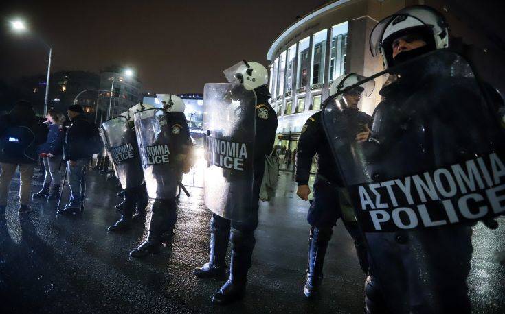 «Ντροπή σας» φωνάζουν οι συγκεντρωθέντες στους άνδρες της Ελληνικής Αστυνομίας που τους έχουν φράξει τη δίοδο, ενώ φωνάζουν και συνθήματα ενάντια στον πρωθυπουργό.