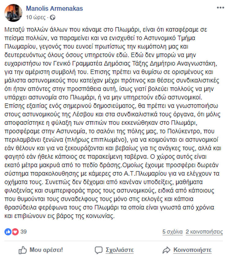 Και προσθέτει: «Επίσης εξαιτίας ενός σημερινού δημοσιεύματος, θα πρέπει να γνωστοποιήσω στους αστυνομικούς της Λέσβου και στα συνδικαλιστικά τους όργανα, ότι μόλις αποφασίστηκε η φύλαξη των σπιτιών που εκκενώθηκαν στο Πλωμάρι, προσφέραμε στην Αστυνομία, το σαλόνι της πόλης μας, το Πολύκεντρο, που περιλαμβάνει ξενώνα (πλήρως επιπλωμένο), για να κοιμούνται οι αστυνομικοί εάν θέλουν και για να ξεκουράζονται και βεβαίως για τις ανάγκες τους, αλλά και φαγητό εάν ήθελε κάποιος σε παρακείμενη ταβέρνα.