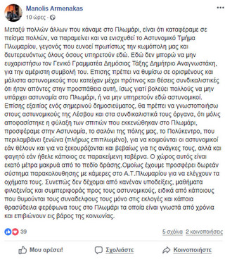 Το περιστατικό σχολίασε σε ανάρτηση στο Facebook ο αντιδήμαρχος Πλωμαρίου Μανώλης Αρμενάκας, ο οποίος στρέφει τα βέλη του κατά αστυνομικών σε συνδικαλιστικές θέσεις, τονίζοντας χαρακτηριστικά: «Δεν δέχομαι από κανέναν υποδείξεις».