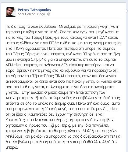 Δείτε το σημερινό status του Π. Τατσόπουλου στο facebook…