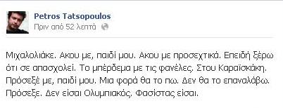 Στου Καραϊσκάκη. Πρόσεξέ με, παιδί μου. Μια φορά θα το πω. Δεν θα το επαναλάβω. Πρόσεξε. Δεν είσαι Ολυμπιακός. Φασίστας είσαι». Τα λόγια αυτά ανήκουν στο βουλευτή του ΣΥΡΙΖΑ, Πέτρο Τατσόπουλο, ο οποίος μέσα από τον προσωπικό του λογαριασμό στο Facebook, απάντησε σε όσα είπε χτες το βράδυ ο Νίκος Μιχαλολιάκος για τις στολές των μελών της Χρυσής Αυγής και τα τάγματα εφόδου.