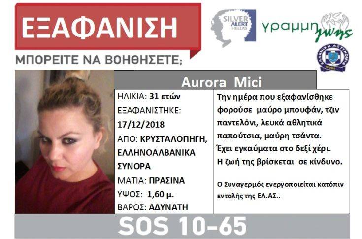 Συναγερμός σήμανε για την εξαφάνιση μιας 31χρονης γυναίκας στα ελληνοαλβανικά σύνορα. Τα ίχνη της 31χρονης Aurora Mici χάθηκαν τη Δευτέρα 17 Δεκεμβρίου 2018 στην περιοχή της Κρυσταλλοπηγής Φλώρινας.