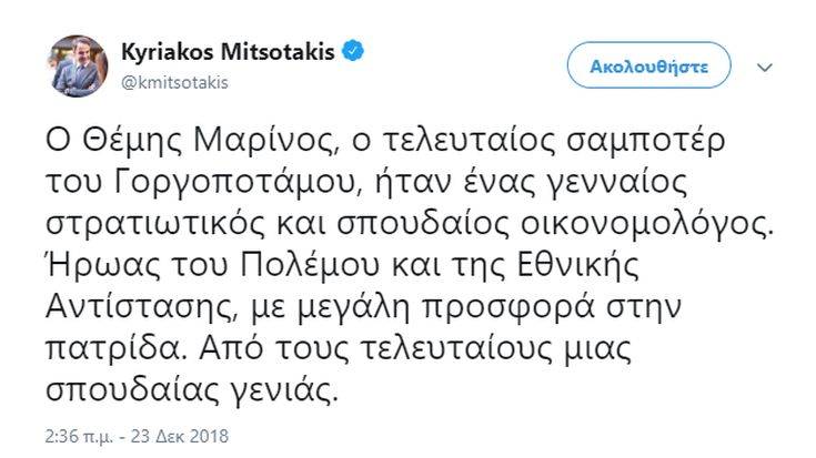 Ο Θέμης Μαρίνος, ο τελευταίος σαμποτέρ του Γοργοποτάμου, ήταν ένας γενναίος στρατιωτικός και σπουδαίος οικονομολόγος. Ήρωας του Πολέμου και της Εθνικής Αντίστασης, με μεγάλη προσφορά στην πατρίδα. Από τους τελευταίους μιας σπουδαίας γενιάς, αναφέρει ο πρόεδρος της ΝΔ Κυριάκος Μητσοτάκης με ανάρτησή του στο twitter.