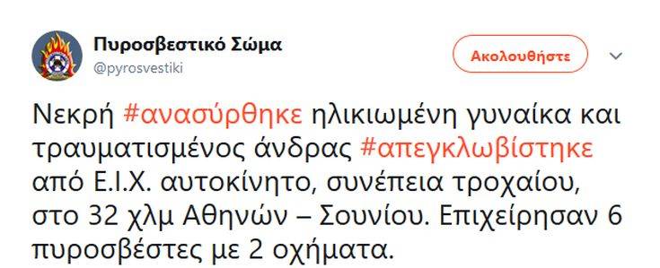 Τροχαίο δυστύχημα, το οποίο στοίχισε τη ζωή σε μια ηλικιωμένη γυναίκα έγινε σήμερα στο 32ο χιλιόμετρο Αθηνών – Σουνίου, σύμφωνα με την ενημέρωση της Πυροσβεστικής.