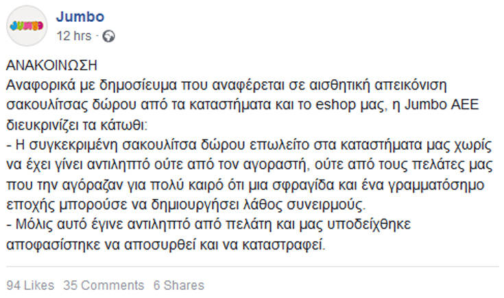 «Αναφορικά με δημοσίευμα που αναφέρεται σε αισθητική απεικόνιση σακουλίτσας δώρου από τα καταστήματα και το eshop μας, η Jumbo AEE διευκρινίζει τα κάτωθι: