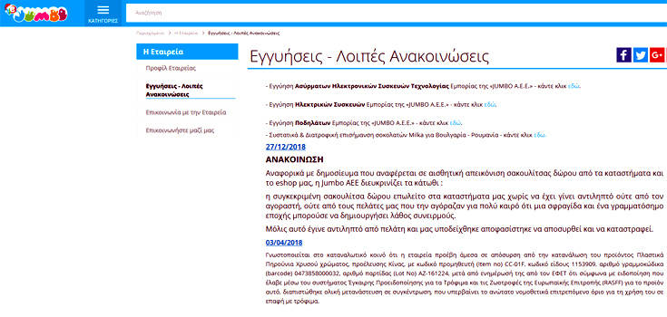 Αναλυτικά η ανακοίνωση της Jumbo: