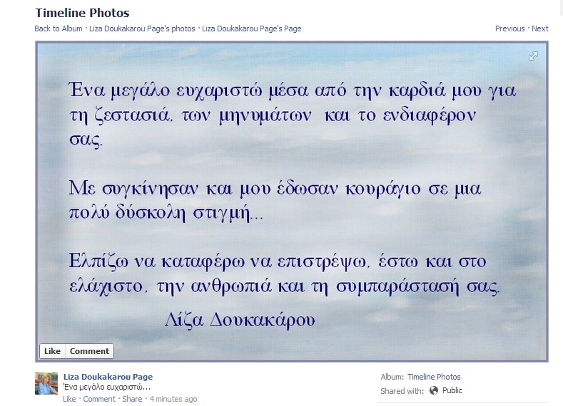Συγκίνησε η Λίζα Δουκακάρου με το μήνυμα που έγραψε στο facebook για να ευχαριστήσει όλους όσοι στέκονται κοντά της τις δύσκολες ώρες που περνάει από την ημέρα που έχασε το σύζυγό της.