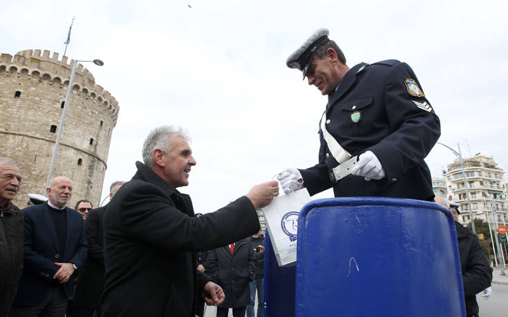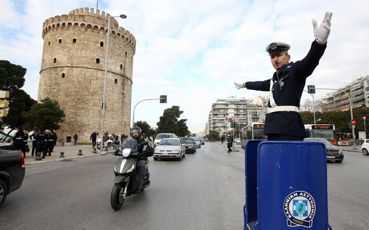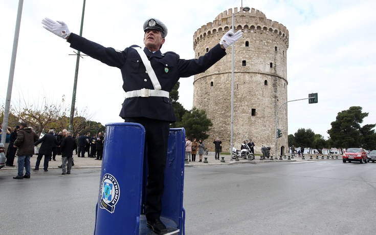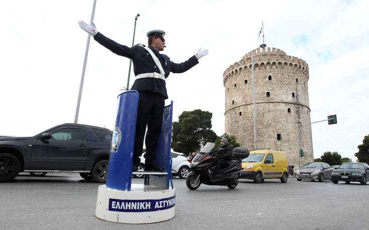 Απέναντι από τον Λευκό Πύργο, στην καρδιά της Θεσσαλονίκης, βρίσκεται σήμερα, παραμονή Πρωτοχρονιάς, ο ρύθμισης τροχονόμος, ο οποίος από το γνωστό «βαρέλι» του, ρυθμίζει την κυκλοφορία των οχημάτων.