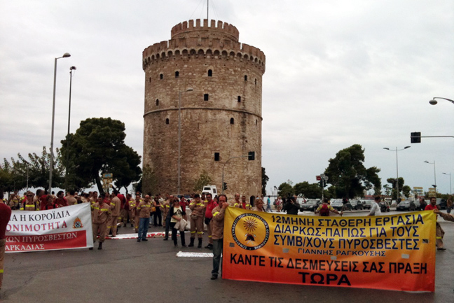 Διαμαρτυρία πραγματοποιούν αυτή την ώρα οι εποχικοί πυροσβέστες στο κέντρο της Θεσσαλονίκης, με αίτημα τη μονιμοποίησή τους.