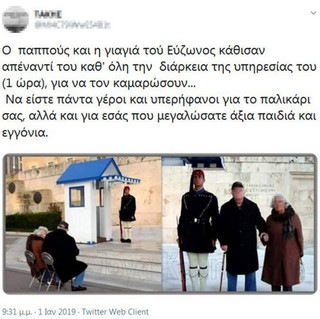 Όπως είπαμε, η όλη ιστορία ξεκίνησε από την ανάρτηση των σχετικών φωτογραφιών στο twitter από έναν απλό χρήστη που έγραψε: «Ο παππούς και η γιαγιά τού Εύζωνος κάθισαν απέναντί του καθ’ όλη την διάρκεια της υπηρεσίας του (1 ώρα), για να τον καμαρώσουν… Να είστε πάντα γέροι και υπερήφανοι για το παλικάρι σας, αλλά και για εσάς που μεγαλώσατε άξια παιδιά και εγγόνια».