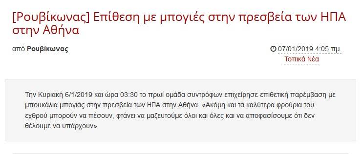 Λίγο αργότερα, ο Ρουβίκωνας με ανάρτηση σε ιστοσελίδα του αντιεξουσιαστικού χώρου, ανέλαβε την ευθύνη για την επίθεση, αναφέροντας χαρακτηριστικά: «Την Κυριακή 6/1/2019 και ώρα 03:30 το πρωί ομάδα συντρόφων επιχείρησε επιθετική παρέμβαση με μπουκάλια μπογιάς στην πρεσβεία των ΗΠΑ στην Αθήνα. “Ακόμη και τα καλύτερα φρούρια του εχθρού μπορούν να πέσουν, φτάνει να μαζευτούμε όλοι και όλες και να αποφασίσουμε ότι δεν θέλουμε να υπάρχουν”».