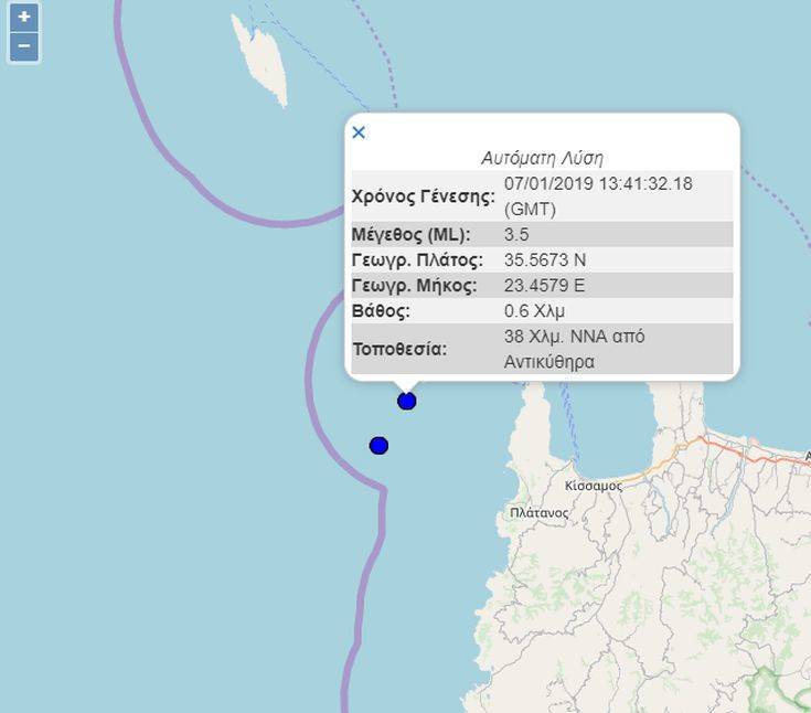 Σεισμός σημειώθηκε πριν από λίγη ώρα στη θαλάσσια περιοχή ανάμεσα στην Κρήτη και τα Αντικύθηρα. Σύμφωνα με το Γεωδυναμικό Ινστιτούτο, ο σεισμός ήταν μεγέθους 3,5 βαθμών της Κλίμακας Ρίχτερ και σημειώθηκε 38 χιλιόμετρα νότιο-νοτιοανατολικά από τα Αντικύθηρα.