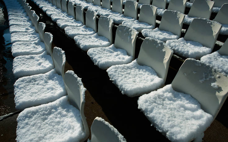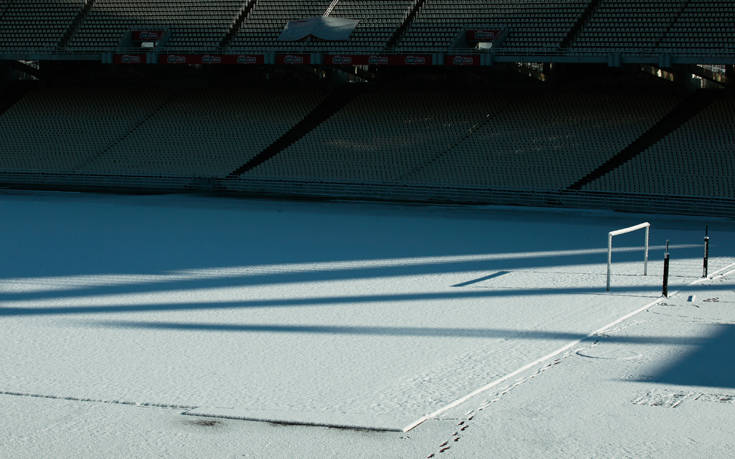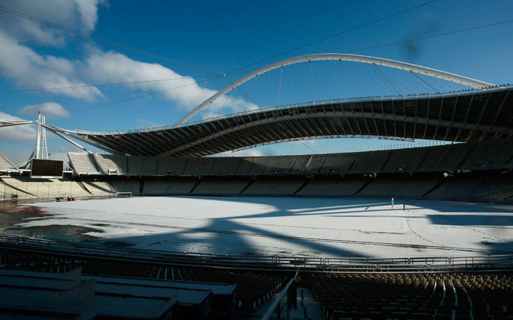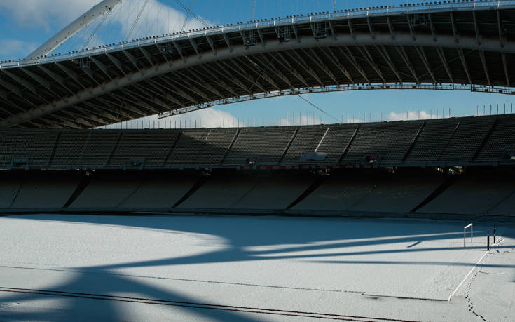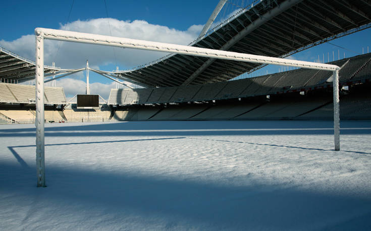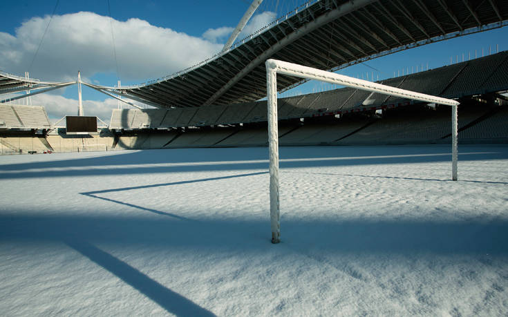 Ένα εντελώς διαφορετικό σκηνικό είχε διαμορφωθεί σήμερα το πρωί στο «Σπύρος Λούης» των Ολυμπιακών Εγκαταστάσεων στο Μαρούσι. Ο πράσινος αγωνιστικός χώρος είχε γίνει λευκός, λόγω της πυκνής χιονόπτωσης που έκανε την εμφάνισή της στα βόρεια προάστια της Αθήνας.