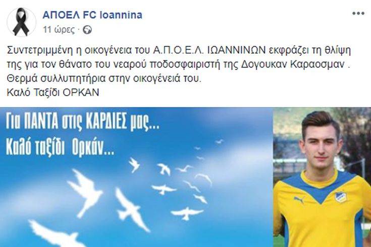 Συλλυπητήρια ανακοίνωση εξέδωσε και η ένωση Ποδοσφαιρικών Σωματείων Ηπείρου, η οποία αναφέρει: «Ο Πρόεδρος και τα μέλη της Ε.Ε. της Ε.Π.Σ.ΗΠΕΙΡΟΥ εκφράζουν τα βαθύτατα συλλυπητήρια στην οικογένεια και τους οικείους, καθώς και στην ποδοσφαιρική ομάδα του Α.Π.Ο.ΕΛ. που αγωνίζονταν, για την απώλεια του νεαρού φοιτητή από την Ξάνθη ΚΑΡΑΟΣΜΑΝ ΔΟΓΟΥΚΑΝ».