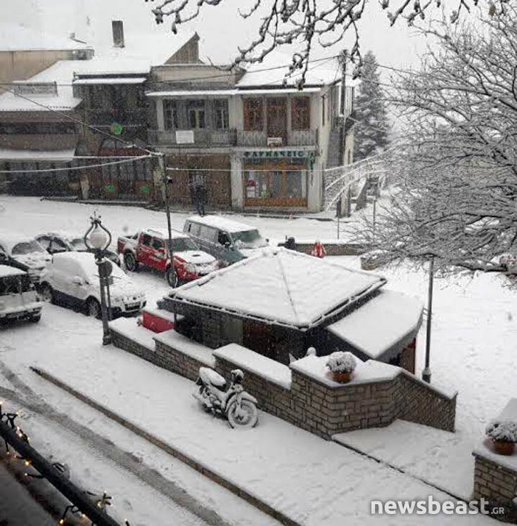 Σπίτια, αυτοκίνητα και μηχανάκια έχουν σχεδόν θαφτεί στο χιόνι. Στο κέντρο της πόλης το χιόνι φτάνει τους 10 με 15 πόντους, η κυκλοφορία των οχημάτων γίνεται μόνο με αντιολισθητικές αλυσίδες ενώ τα λεωφορεία των ΚΤΕΛ δεν μπορούν να φτάσουν στο κέντρο.