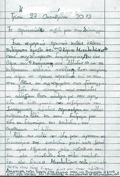 Η έκθεσή της έχει τίτλο «το περιπετειώδες ταξίδι μου στο Σύνταγμα» και η Δήμητρα αναφέρεται και στον κ. Μιχαλολιάκο και σε μια συγκέντρωση διαμαρτυρίας που είχε οργανώσει με θέμα η «Κατάρρευση της Ελλάδας».
