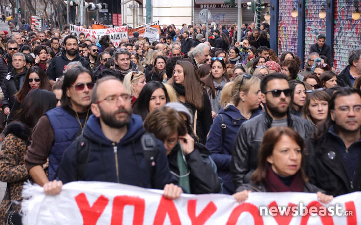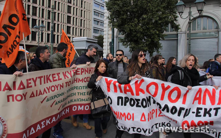 Μέλη της Διδασκαλικής Ομοσπονδίας Ελλάδας και της Ομοσπονδίας Λειτουργών Μέσης Εκπαίδευσης, με πανό και σημαίες στα χέρια τους και βασικό τους σύνθημα το «εδώ και τώρα απεργία» κατευθύνθηκαν προς το Κοινοβούλιο, συνεχίζοντας την κινητοποίησή τους.